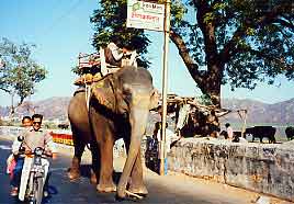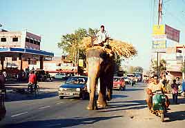 車やバイクは象を避けて走る。交通渋滞はあまり気にならないらしい。