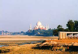 ヤムナー川からタージマハルを臨む。ここからでも迫力を感じる。