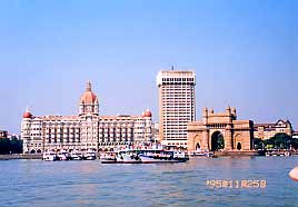デリー門(右)とムンバイを代表する高級ホテル、タージマハルホテル(左)。この場所からエレファンタ島に渡る船が出港する。 |