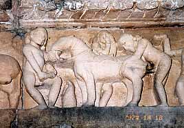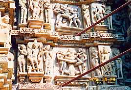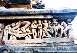 この彫刻も有名。左の写真の彫刻の横に位置する。カジュラホに来たらこれを見なきゃね。 |