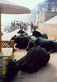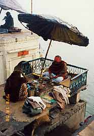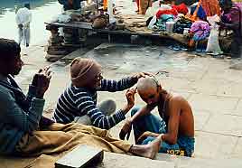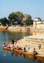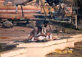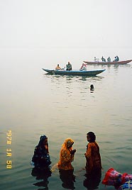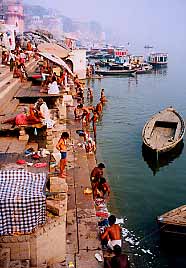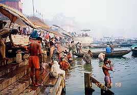 ガンガー(ガンジス河)にて。奥の人が沐浴する一方、手前の人は洗濯。時には用を足す人もいる。 |