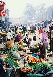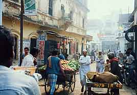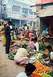 八百屋はどの街に行っても同じスタイル 。道端に野菜を並べれば牛が寄って来る。 |
