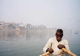 ガンガー(ガンジス河)クルーズ。船に乗るときは複数で。料金も割り勘だし、万一船頭が悪人だった場合に備えて。 |