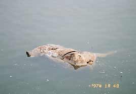 ガンガー(ガンジス河)を流れる死体。この物体は牛か。 |