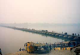 ガンガーに架かる浮き橋 。リクシャーで渡ったが、意外と揺れない。 |