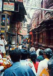 バナラシの町をリクシャーにのって移動する。左下はドライバーの背中。 |