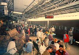バラナシ駅 。ここでカルカッタ行きの夜行列車を待つことになるが、出発予定時刻が3時間遅れても、列車は到着しない。構内のアナウンスも聞き取れず、駅員も把握しておらず、不安な待ち時間であった。結局3時間以上も待たされた上、カルカッタに到着したのは到着予定時間の6時間後であった。恐るべしインド時間。 |