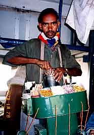 バナラシからカルカッタ行き列車内で見かけた弁当屋。その場でお好みの具をトッピングしてくれる。食べたいとは思わない。 |