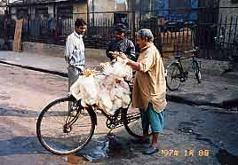 カルカッタで見かけた、鳥肉屋。自転車にぶら下がっているのは、鶏。 |